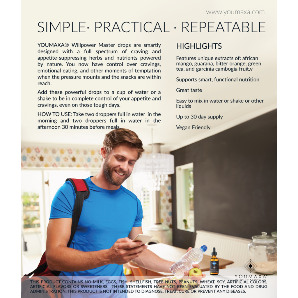 YOUMAXA® Willpower Master drops are smartly designed with a full spectrum of craving and appetite-suppressing herbs and nutrients powered by nature. You now have control over cravings, emotional eating, and other moments of temptation when the pressure mounts and the snacks are within reach.